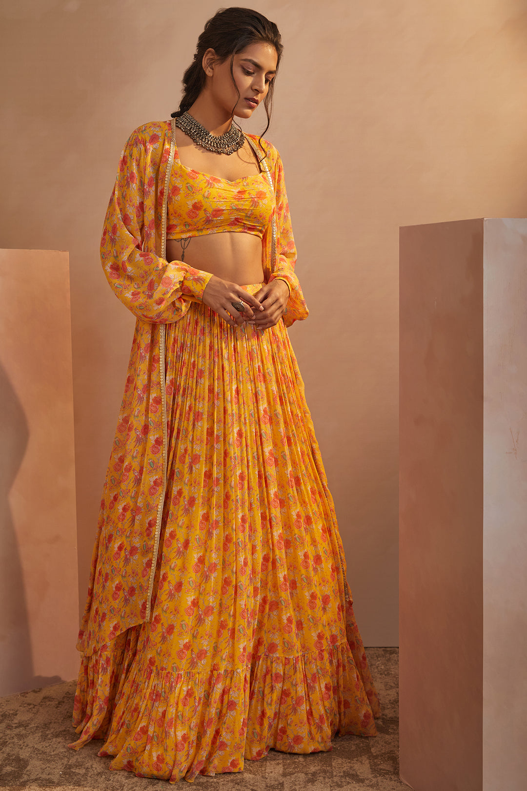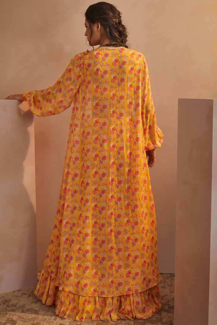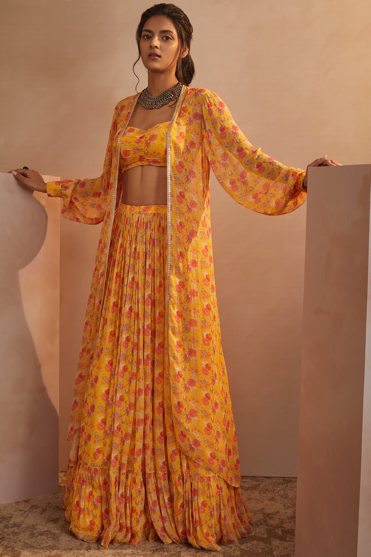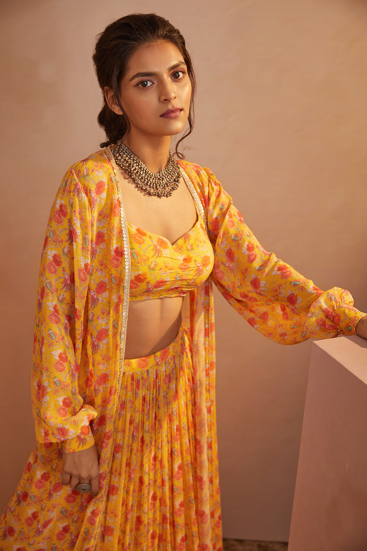 Featuring A Yellow Printed Skirt, Balloon Sleeve Jacket And Roshing Printed Blouse.