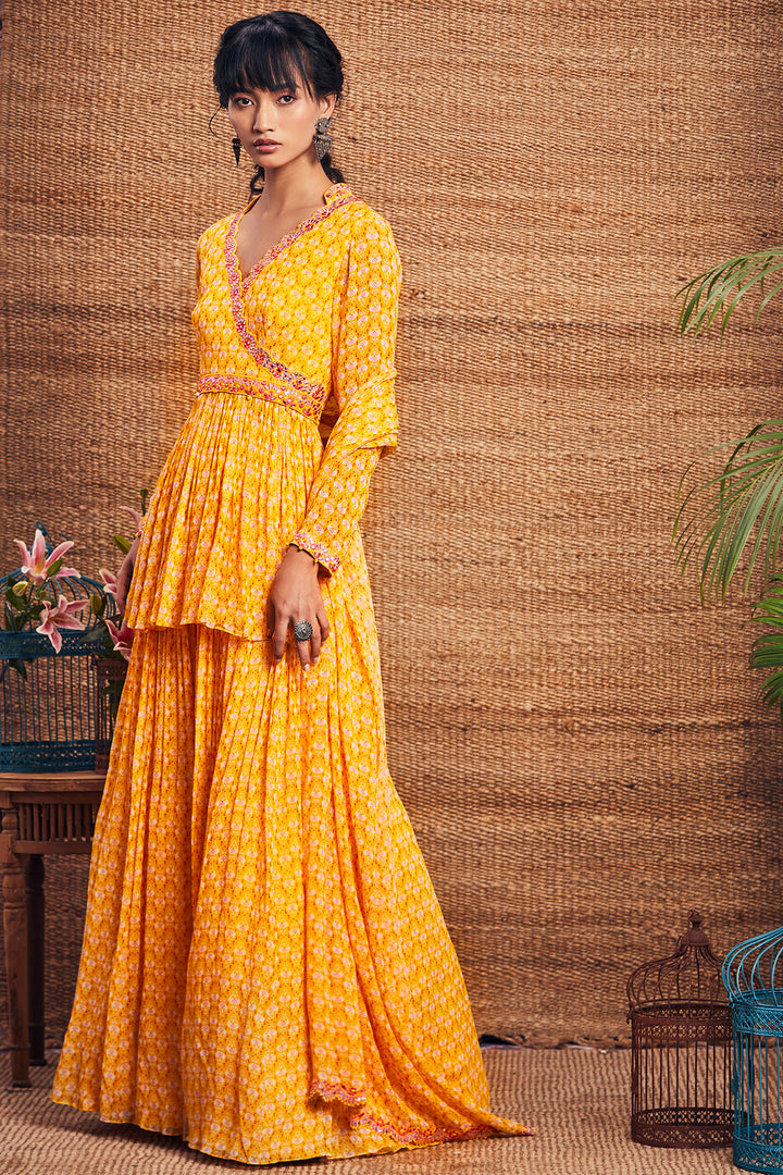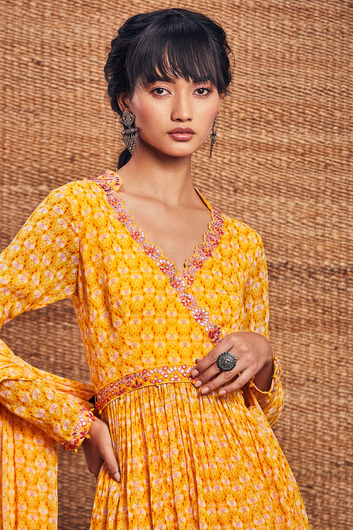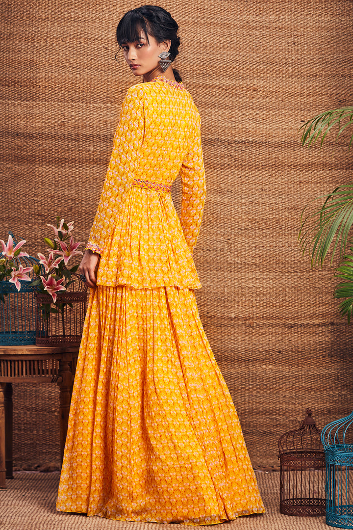 Featuring A Yellow Overlapped Kurta In Georgette Base With Embroidery. It Is Paired With A Matching Skirt And A Belt.