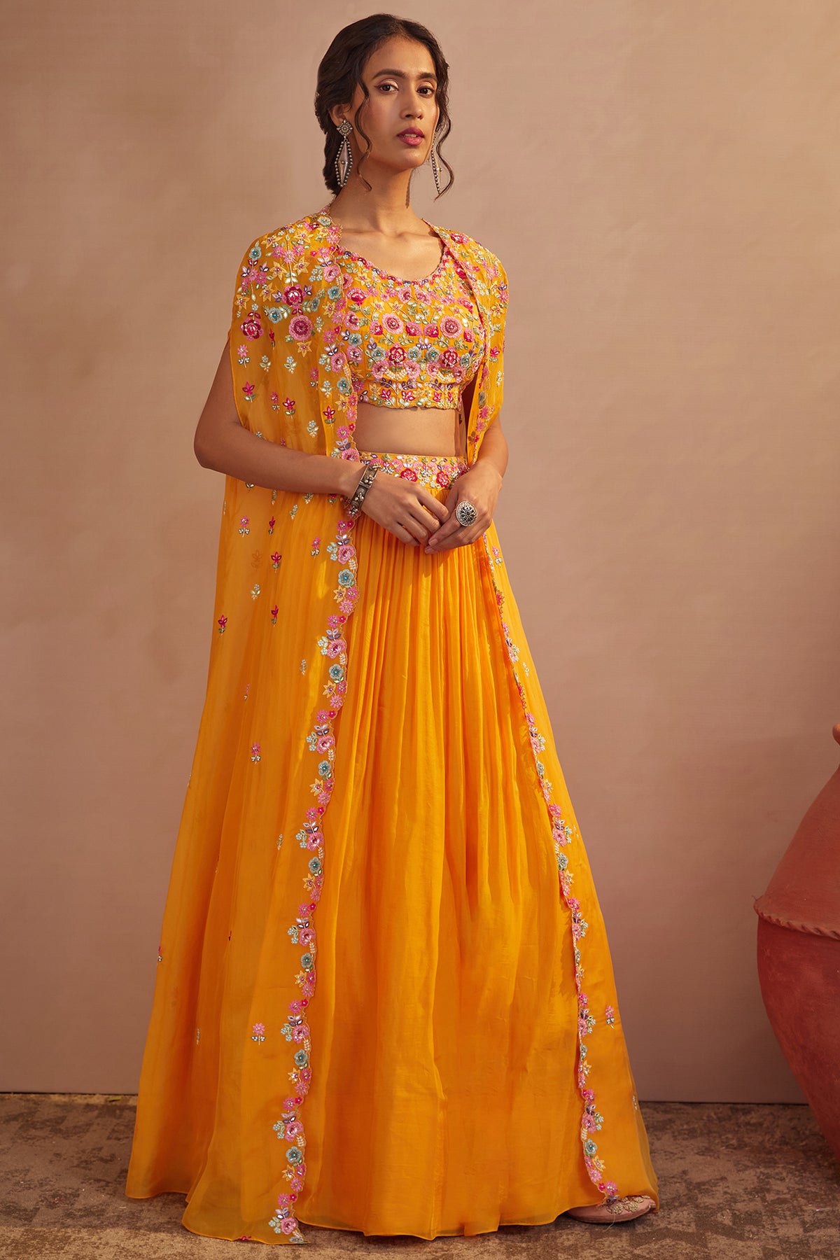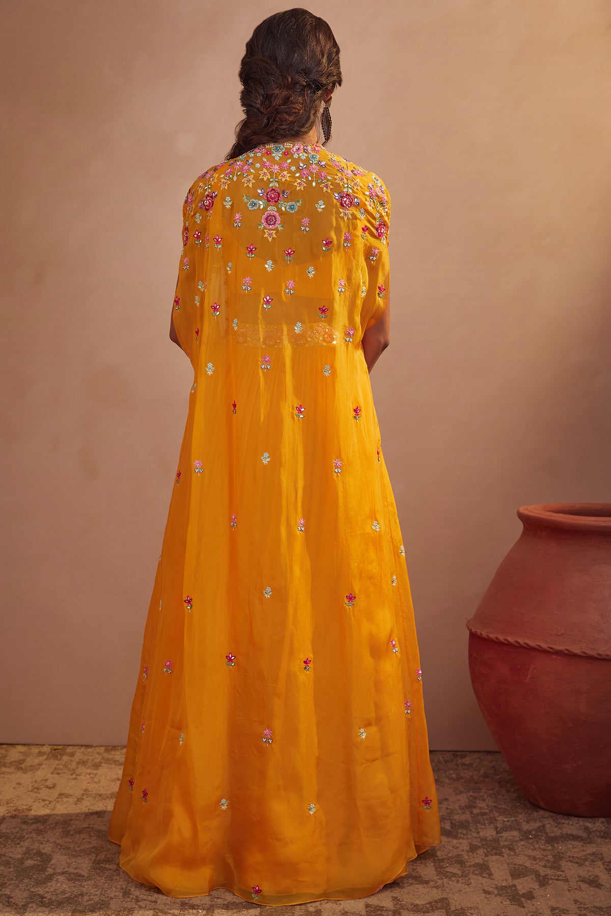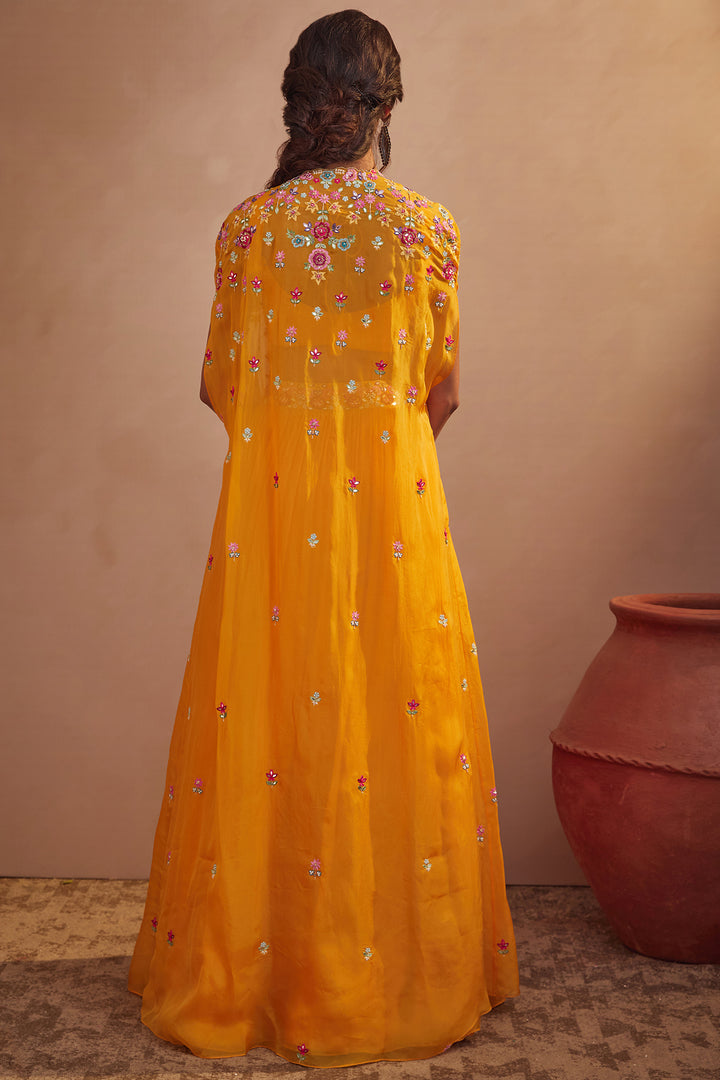 Featuring A Yellow Soft Organza Skirt, Full Length Cape Jacket And A Sleeveless Blouse. The Blouse Is Hand Embroided With Touches Of Thread, Mirror And Sequin Work.