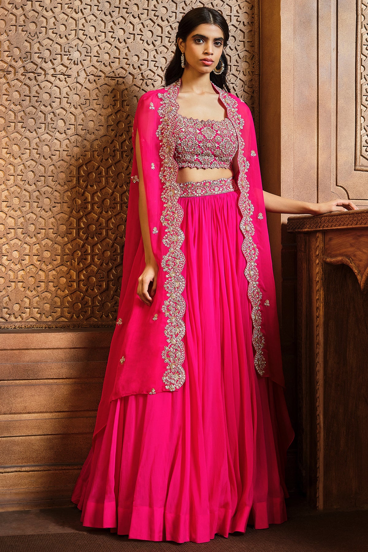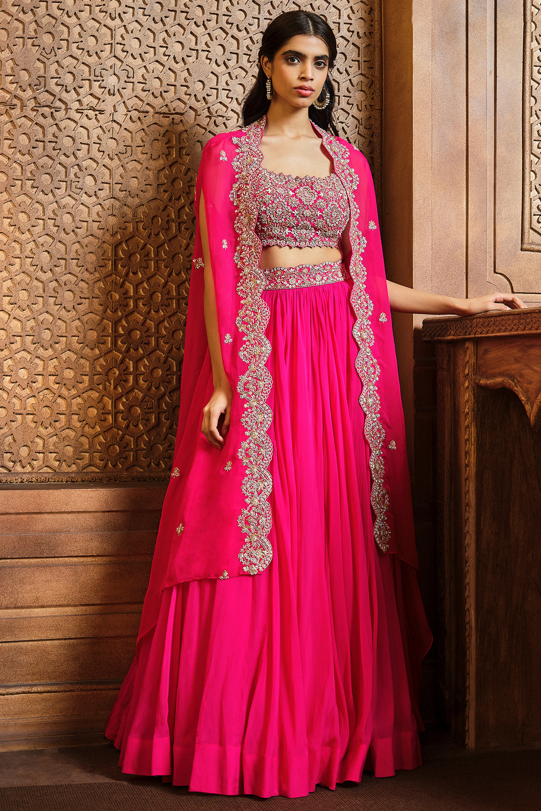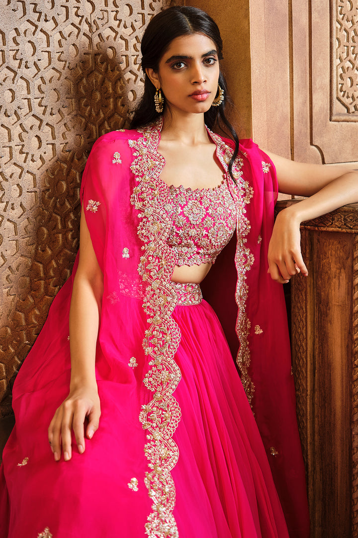 Featuring A Rani Pink Soft Organza Skirt With Hi-Low Scalloped Embroidered Cape And All Over Floral Blouse. The Intricate Embroidery Has Saree, Sequin, Cut dana In Gold Tones.