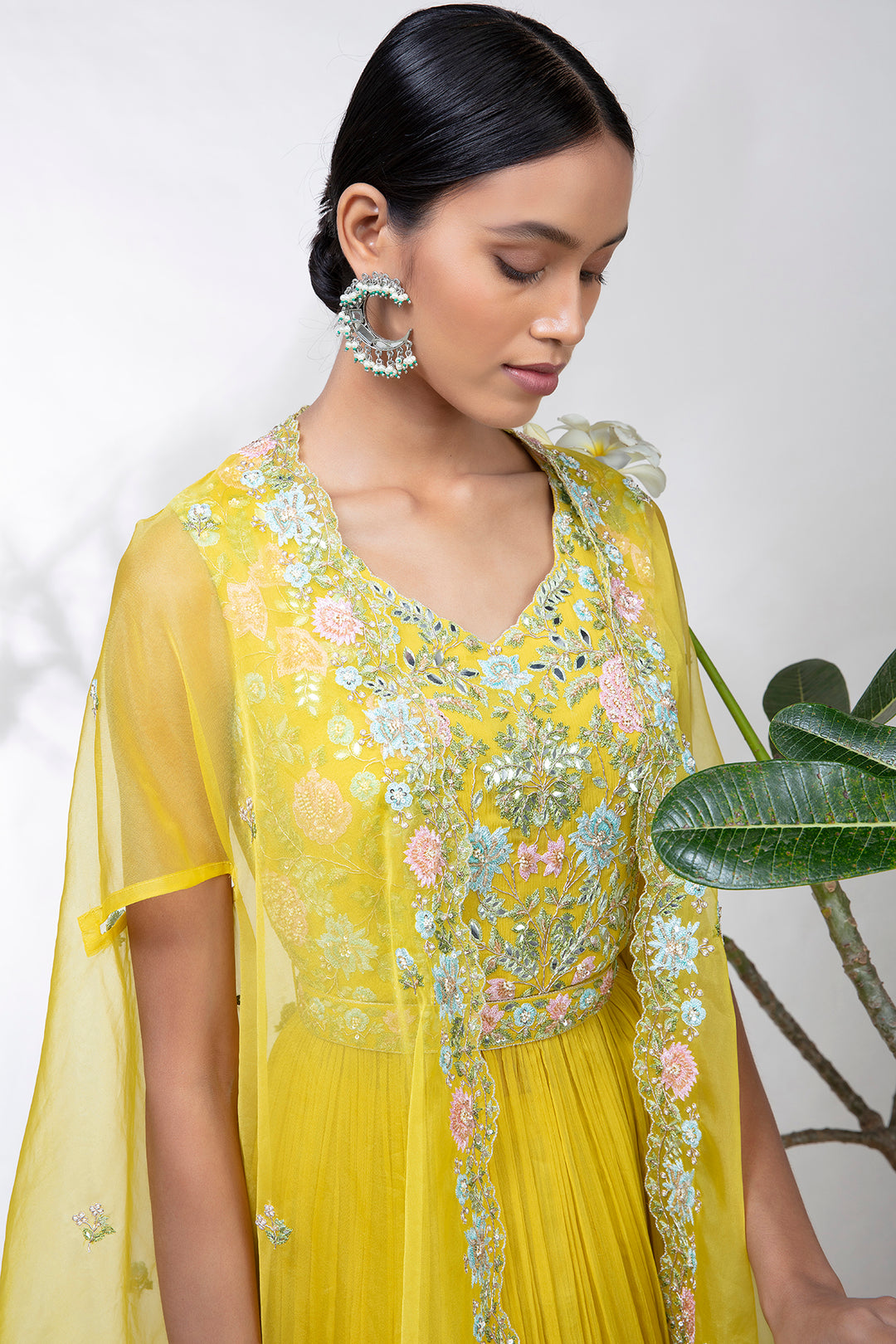 Featuring A Yellow Lehenga In Chiffon And Organza Base With Embroidery. It Is Paired With A Matching Anarkali And Cape