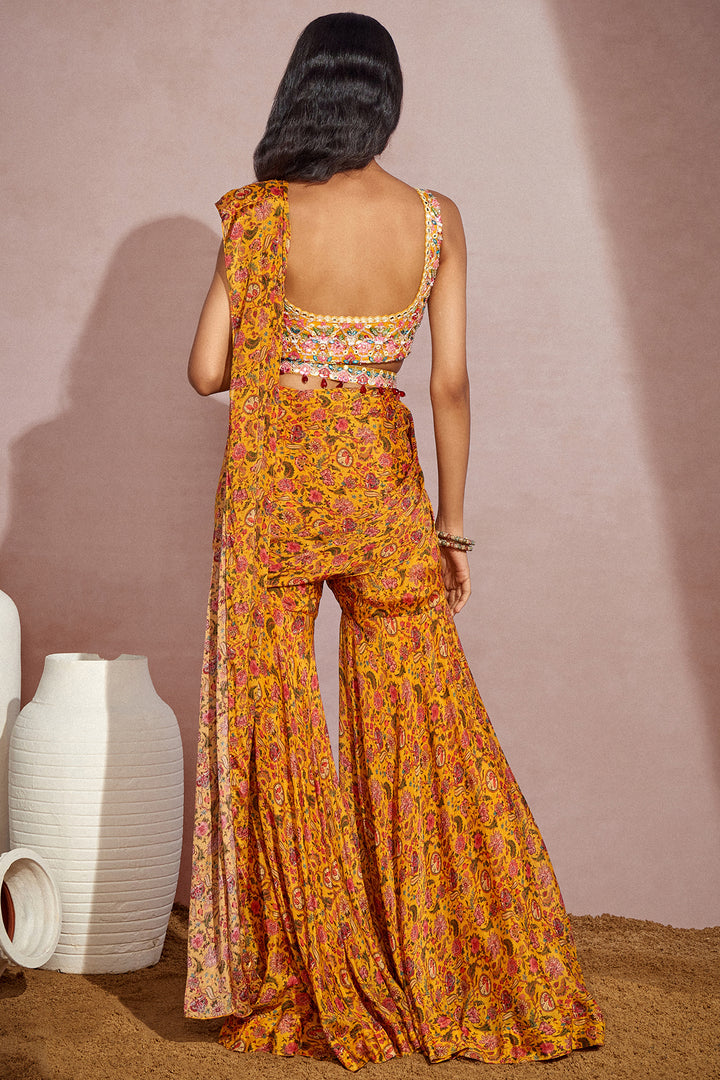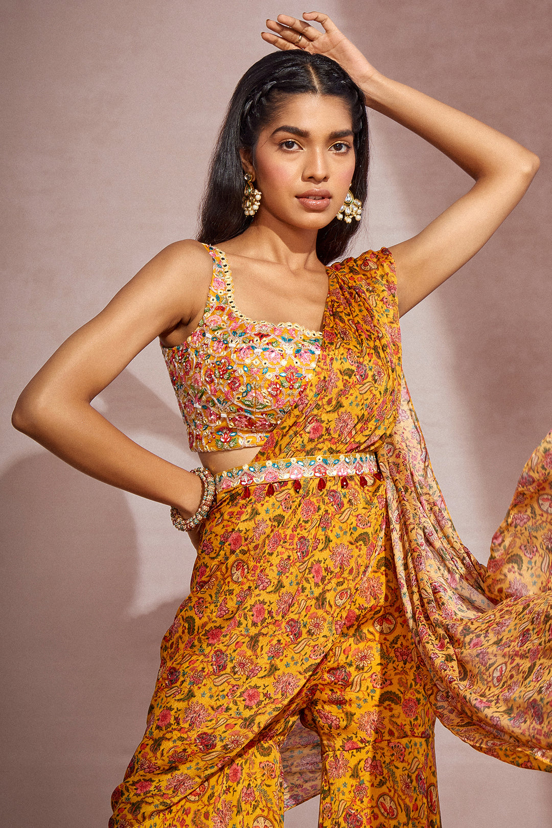 Featuring A Yellow Paisley Printed Draped Sharara Saree With A Zardosi Embroided Blouse And Belt With Drops.