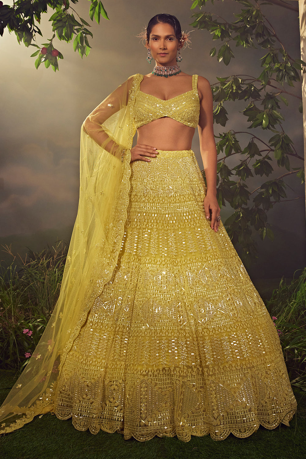 Dhvani Bhanushali in Yellow Organza Embroidery Bridal Lehenga Set