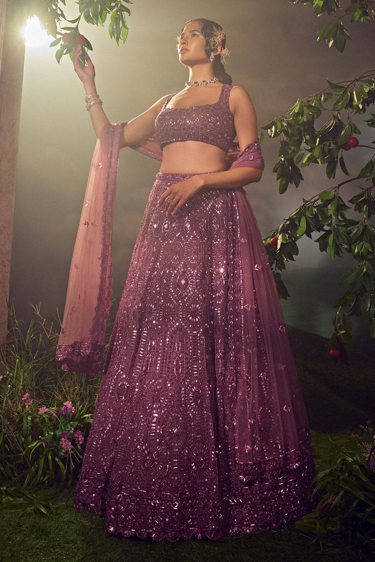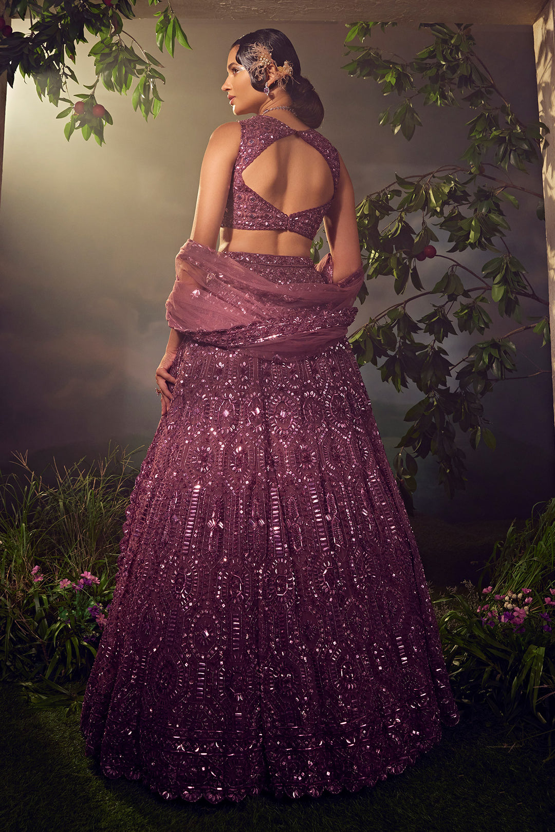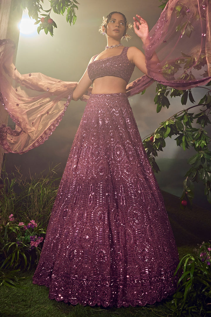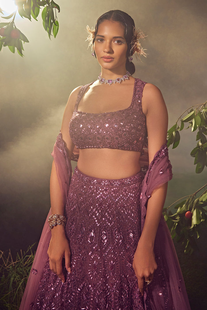 Featuring a argyle purple tulle lehenga embroidered fully by hand with various ornamental metallic sequences and Japanese bugle beads. It is paired with a scallop dupatta and a stylised blouse .