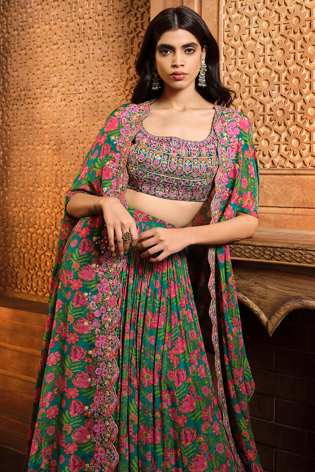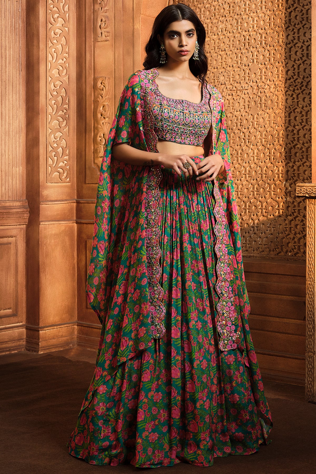 Featuring A Chiffon Green Floral Printed Skirt With Embroidered Multicolor Sleeveless Blouse. It Comes Along With A High Low Cape With Front Border.