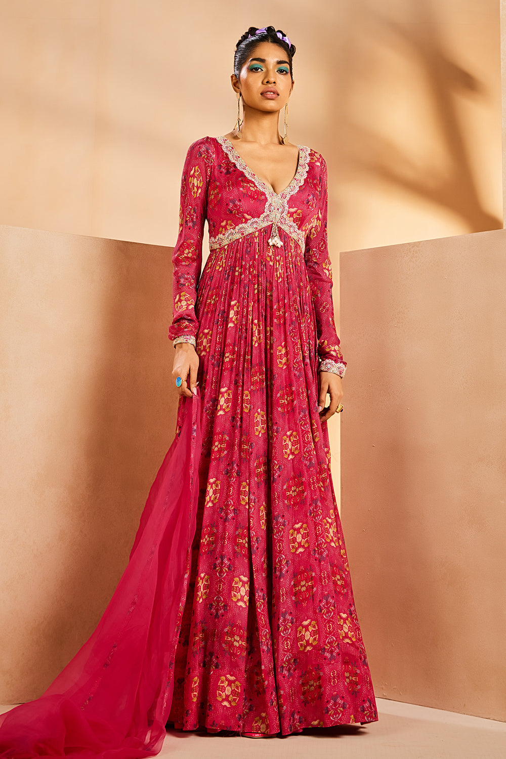 Festive wear from Aneesh Agarwaal is the best in class and gives you a variety of styles and designs to choose from! Get ready to fall in love with the stunning olive green printed drape saree. The ensemble comes with a zardosi blouse and a belt for a chic appeal. The hints of thread, mirror, and sequin work add just the right amount of glamour to the look. If you’re looking for a cheerful set for a Diwali party, look at the peach lehenga, inked in tropical hues with heavy mirrors and foil applique embroidery all over. The blue-printed Gharara set is a great pick for a wedding ceremony. It comes in a georgette base set adorned with a mirror and Resham embroidery work. The yellow overlapped kurta in a georgette base with embroidery paired with a matching skirt, a belt is perfect for a mehendi ceremony, Anarkali Dresses For Girls and Ball Gowns. With so many gorgeous festive sets to choose from, you’re sure to find something that suits your taste.