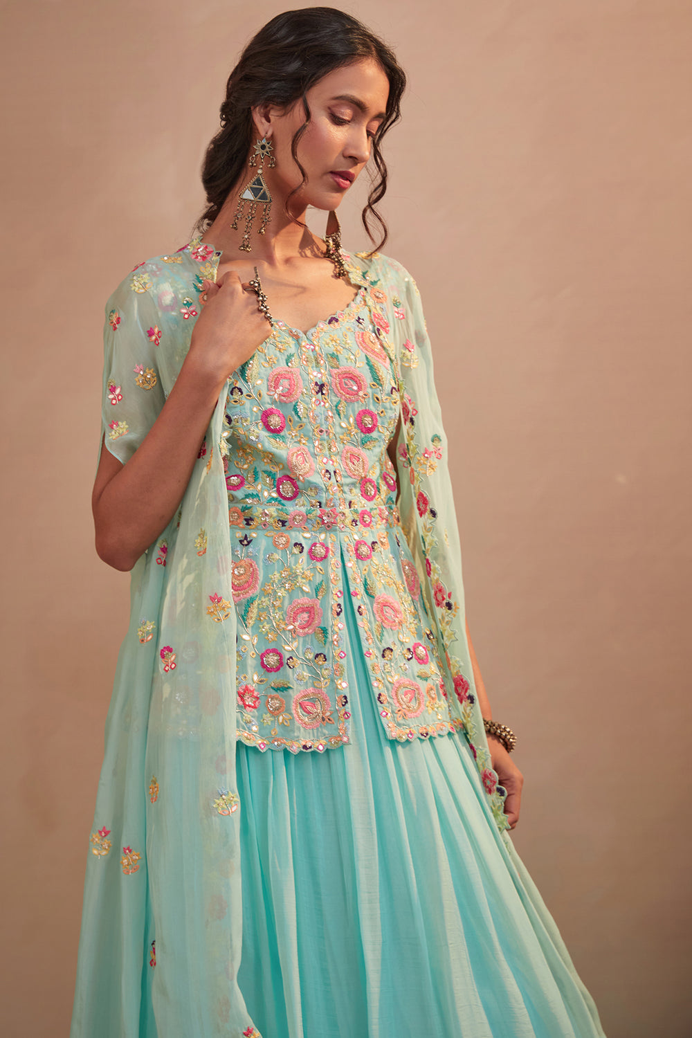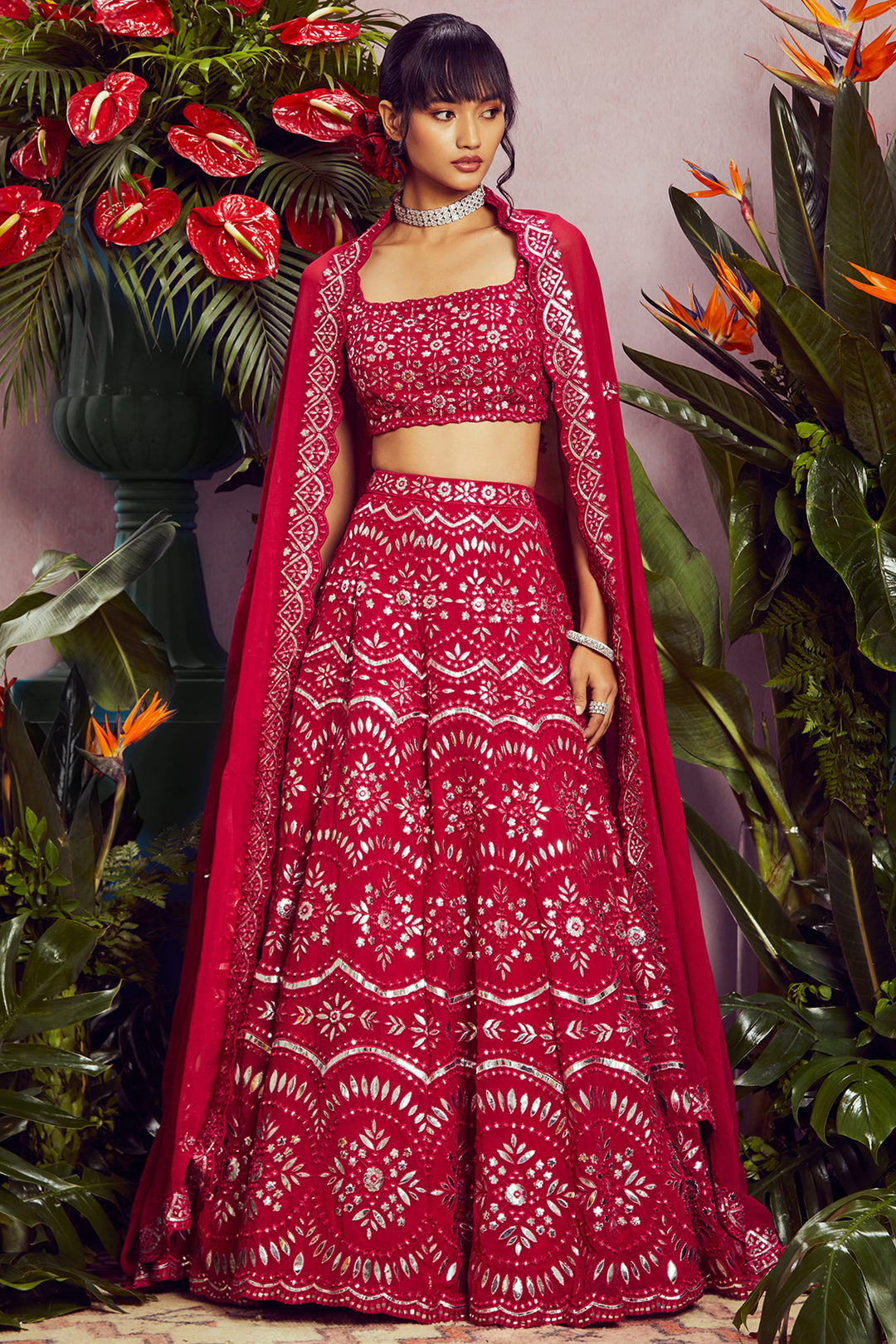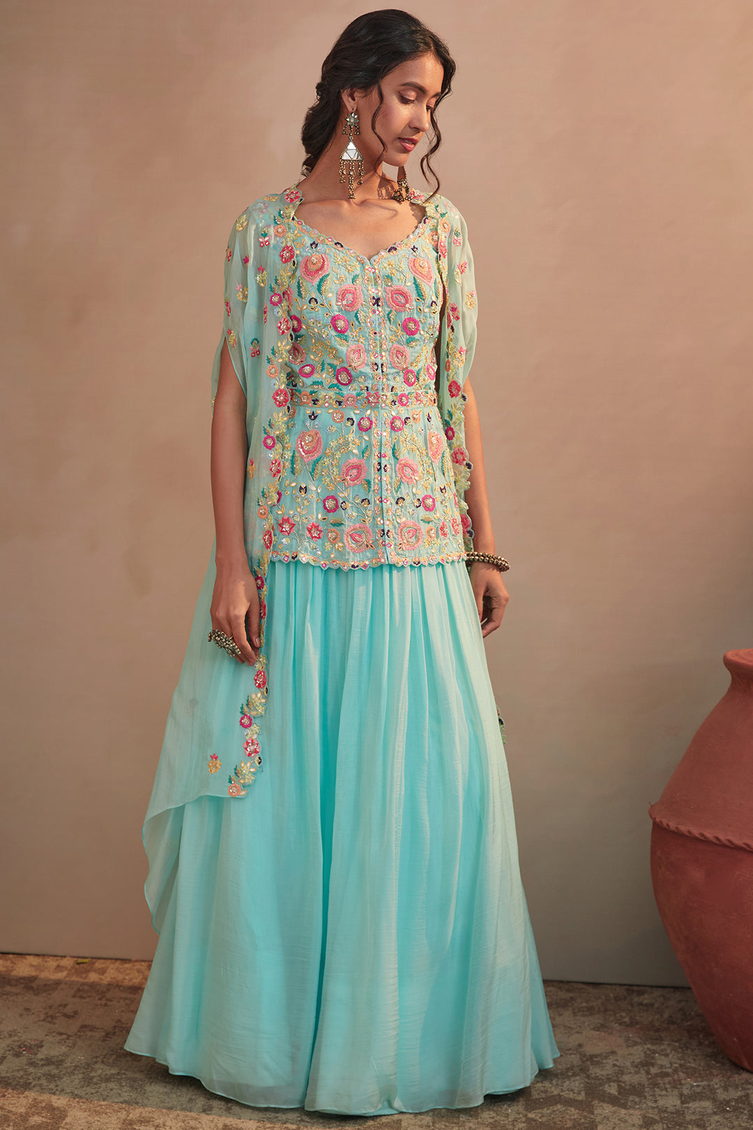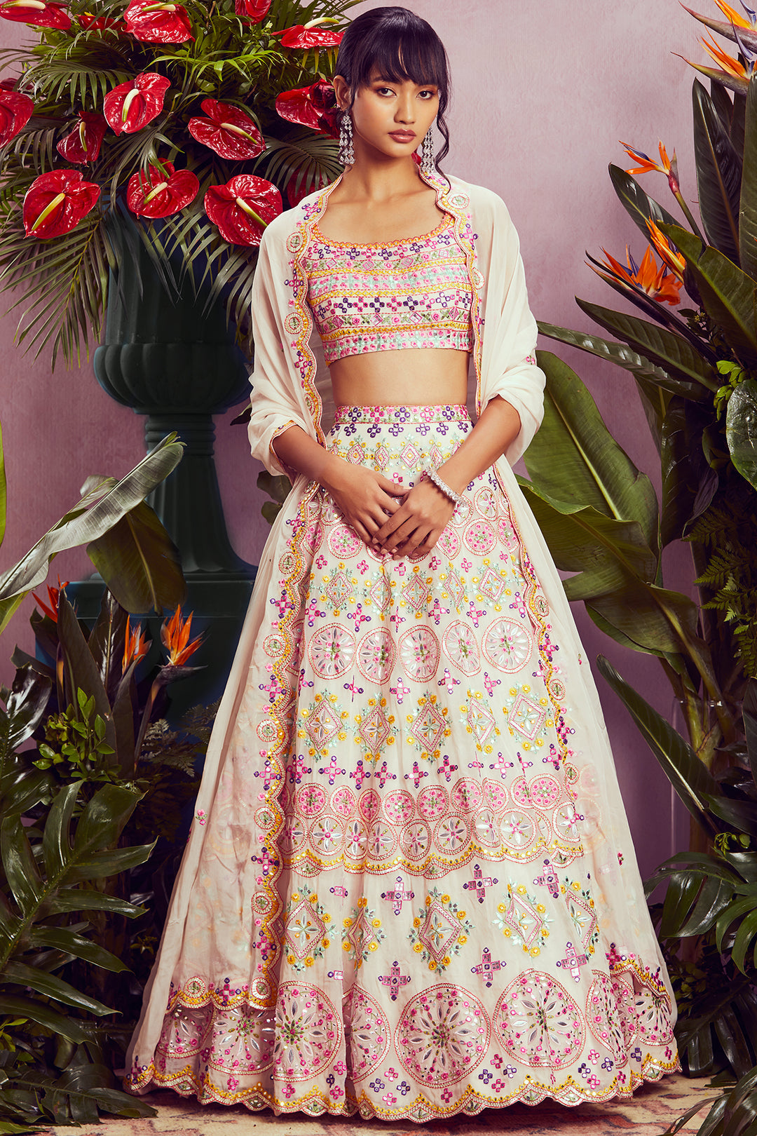 If you want to seem traditional, modern, and Indian, Aneesh Agarwal's lehengas are gorgeous ethnic wear. If you're looking for a timeless and fashionable outfit with an Indian flair, an embroidered jacket and lehenga combo is perfect. On your special day, wedding lehengas in a variety of lovely designs and patterns will offer you a soft and alluring bridal appearance. Traditional lehengas are best suited for bridesmaids and are always prepared for a sleek, glistening appearance. The greatest fusion lehengas to have an Indo-Contemporary look with the sophisticated style are those with a myriad of patterns, such as embroidered cape lehengas, jacket and lehengas, organza cape, and skirt lehenga sets with distinctive blouse designs. Pre-draped sarees, ruffle sarees, and patterned sarees are fantastic options for ethnic wear. Aneesh Aggarwal also has sarees with floral and polka-dot motifs to offer you a stunning appearance.