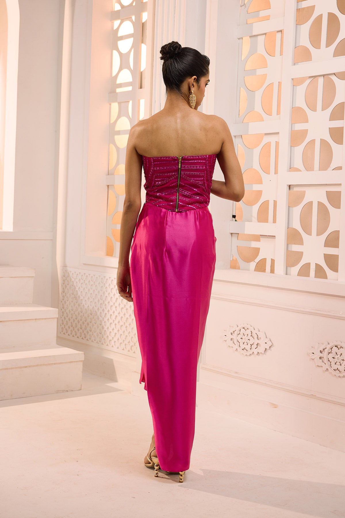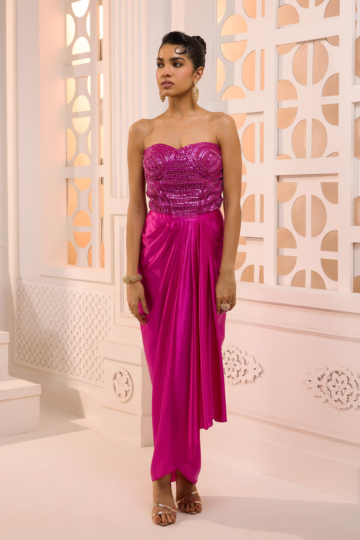 A striking fuchsia ensemble featuring a sculpted, strapless hand sequined & beadwork bodice that contours beautifully for a glamorous silhouette. Paired with a fluid draped satin skirt, this statement look is perfect for cocktail evenings and festive celebrations.