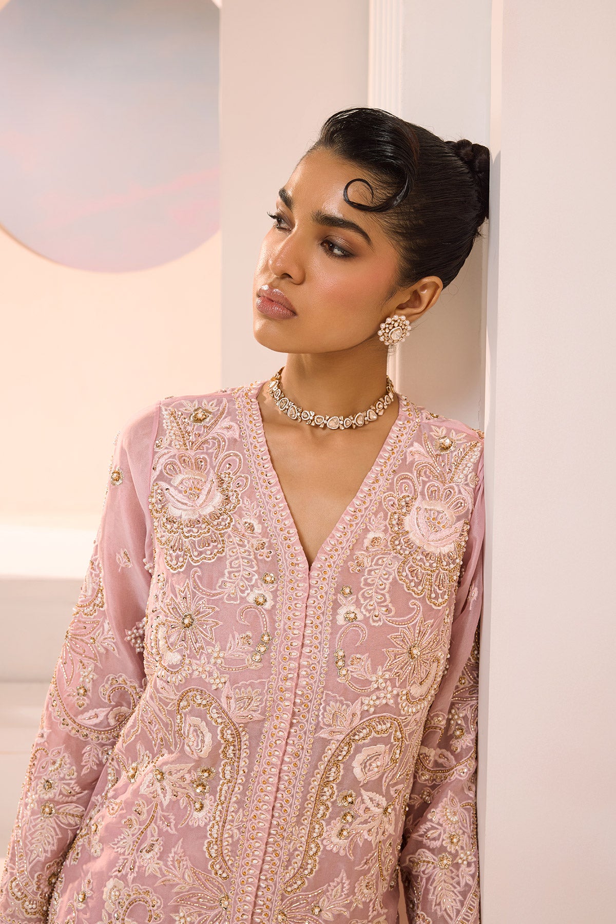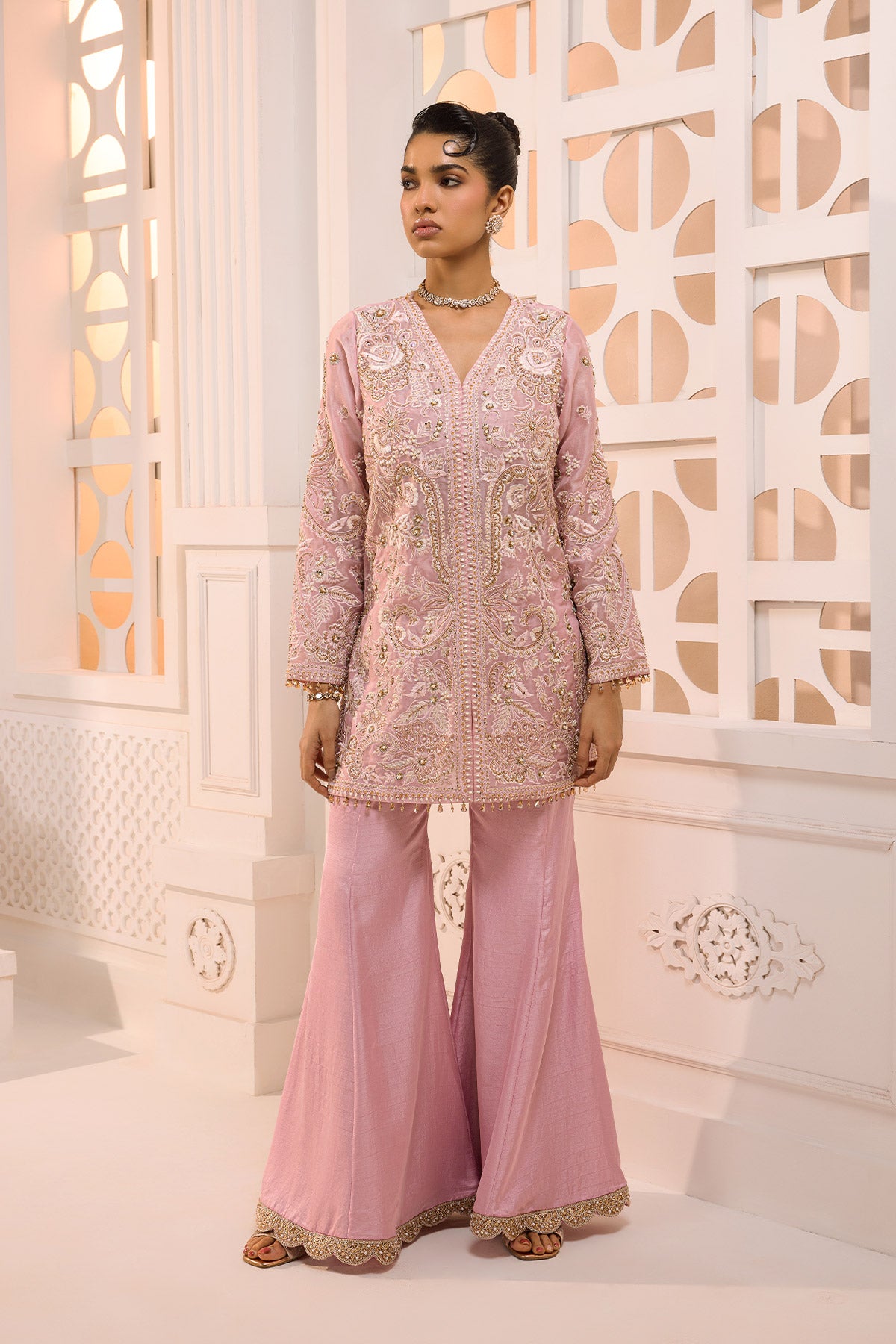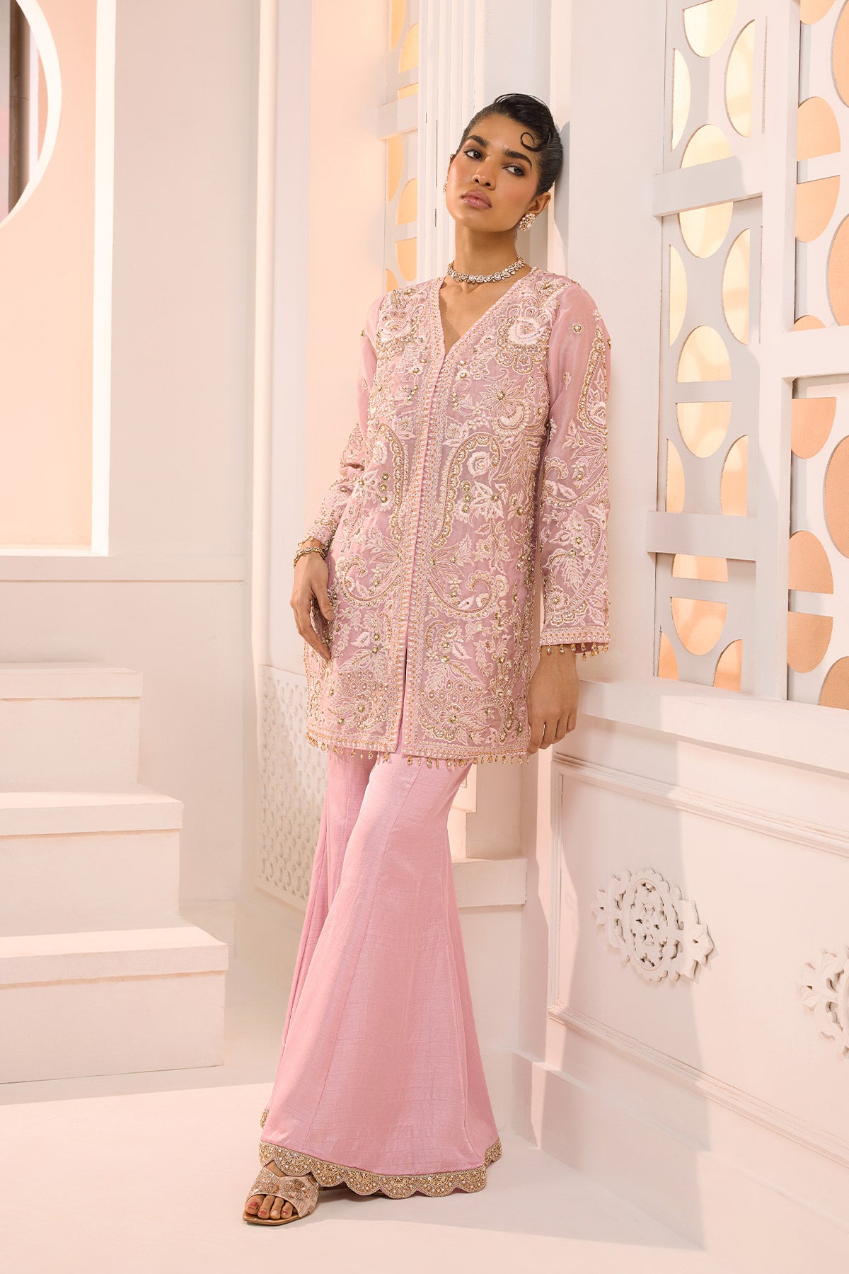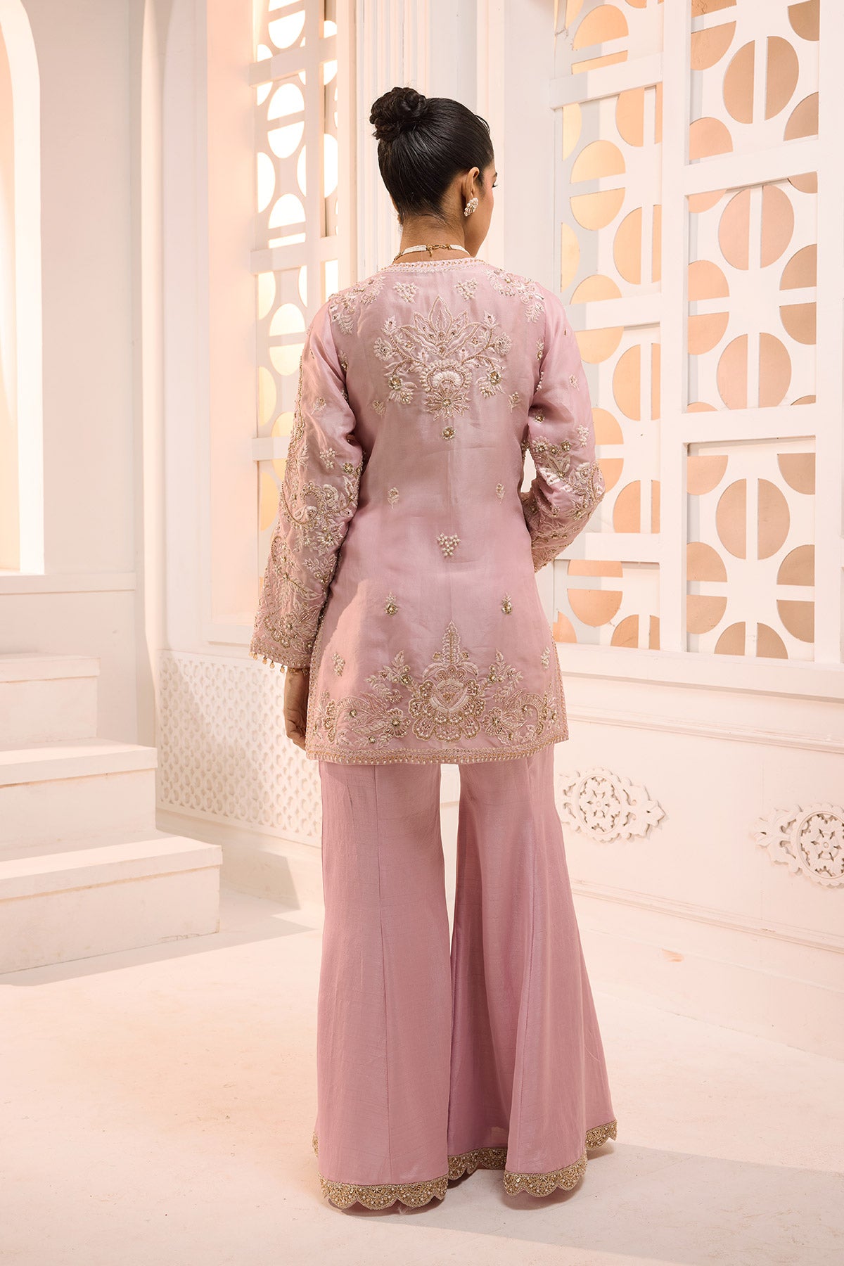 A blush pink hand embroidered jacket style organza kurta adorned with thread , pearl , sequins and beadwork, designed with a flattering V-neckline and refined detailing. Paired with flowing flared sharara finished with a scalloped border, this ensemble exudes effortless elegance for festive and special occasions.