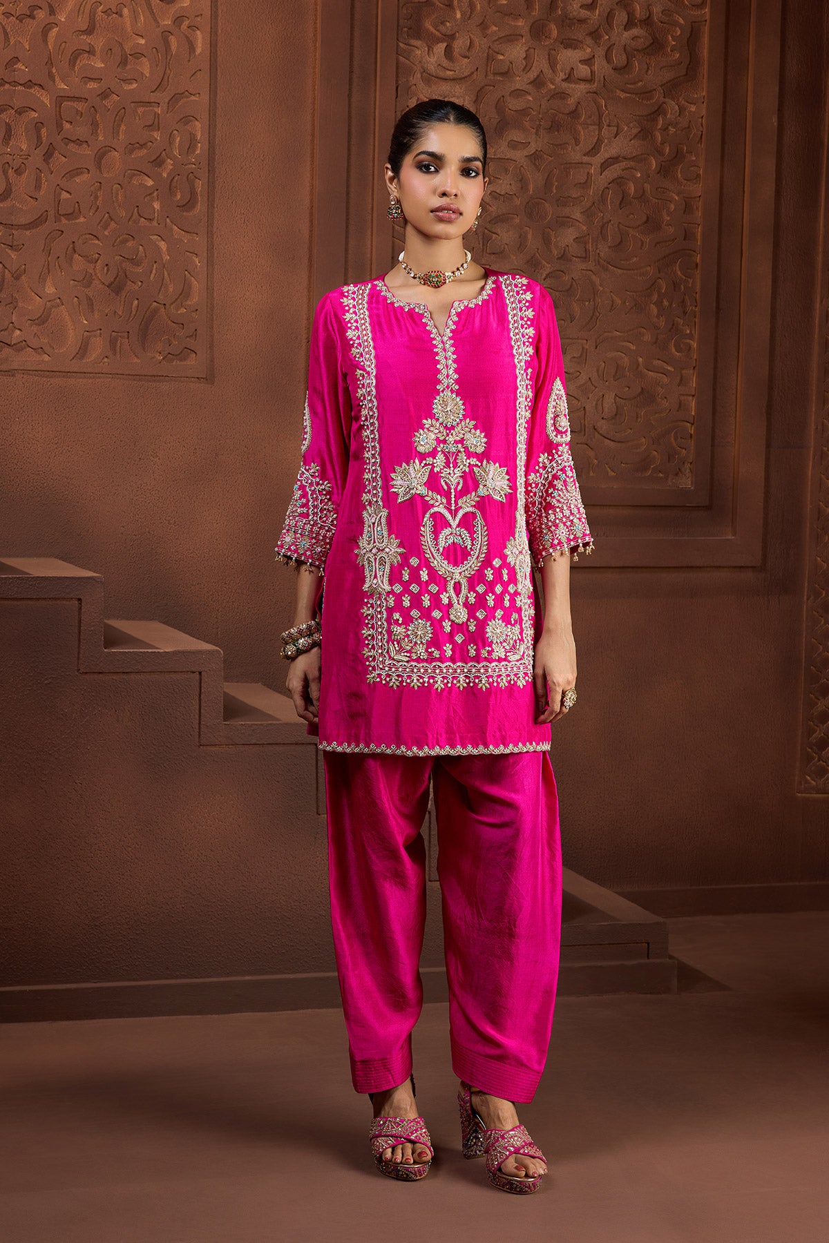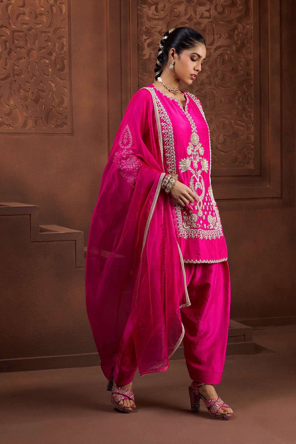 This vibrant fuchsia-pink kurta set features meticulously hand-embroidery adorned with intricate silver-gold floral motifs and delicate scalloped hemlines. Paired with matching, relaxed-fit salwar, it offers a striking fusion of traditional artistry