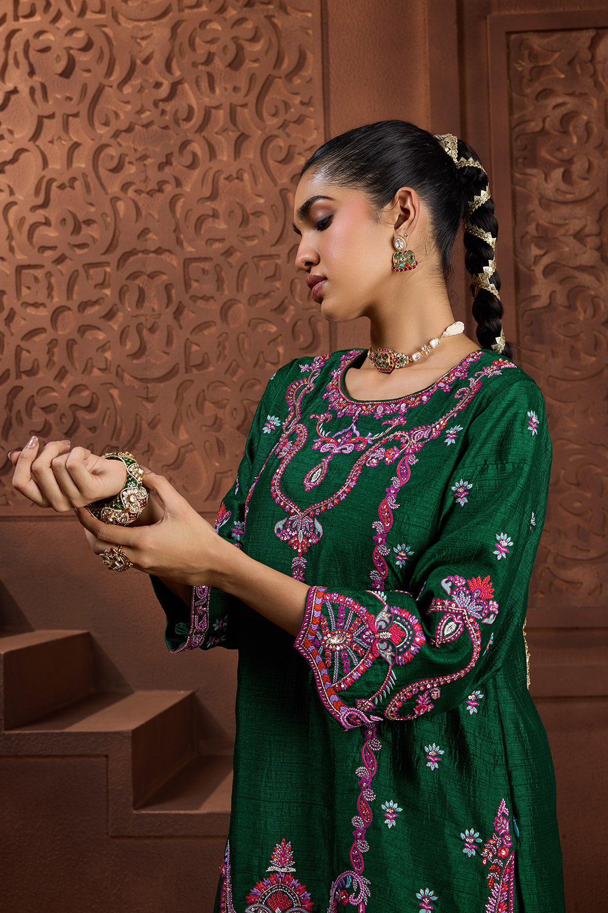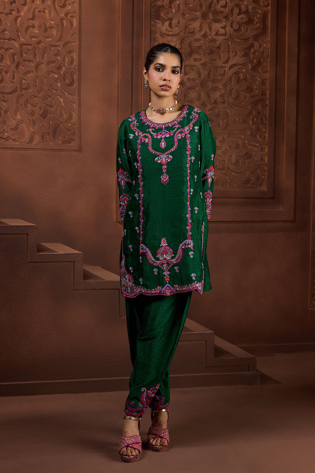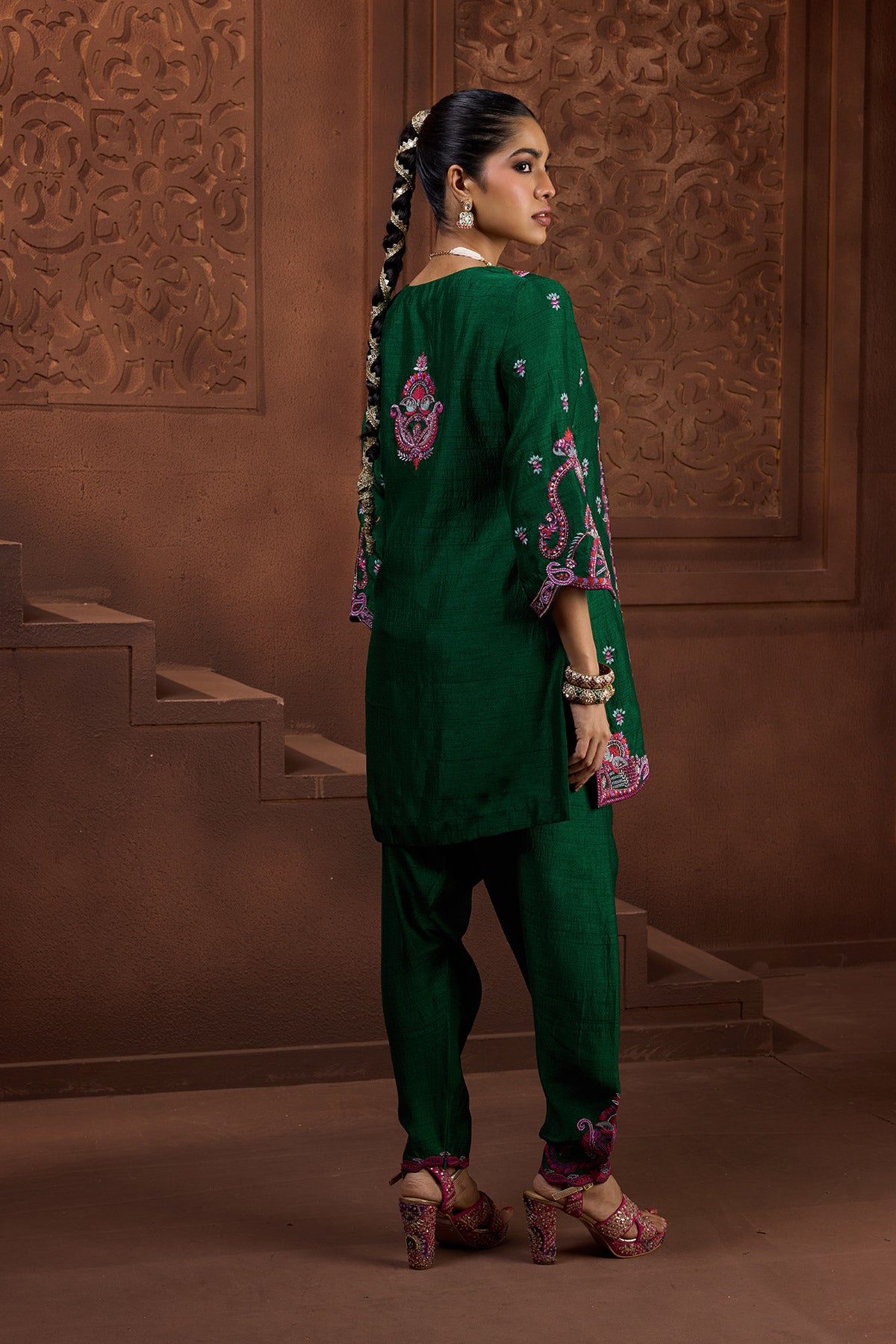 This striking emerald-green kurta set features a richly hand-embroidered kurta adorned with intricate pink and purple floral motifs . Paired with matching skinny salwar with embroidery detail at hem, it offers a vibrant fusion of heritage craftsmanship