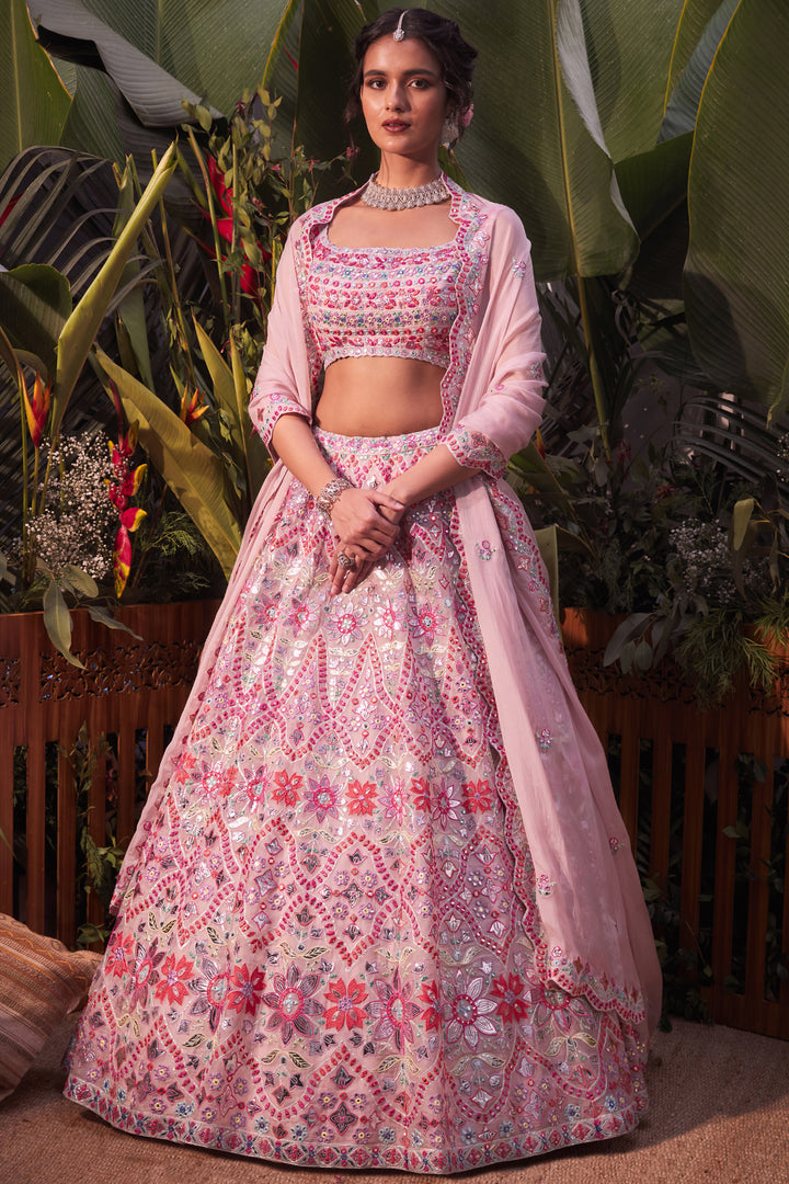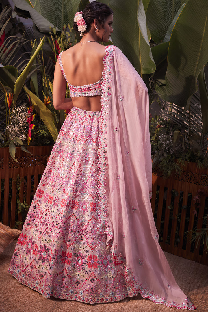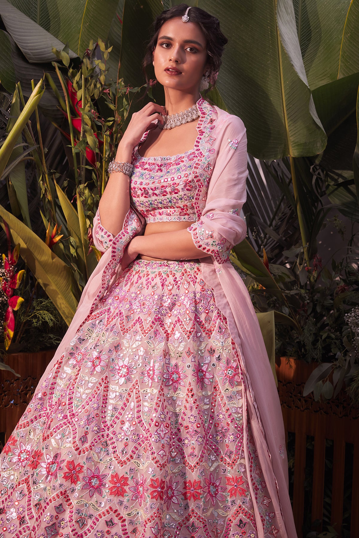Featuring A Lilac Organza Lehenga With Multicolor Tones, Mirror And Foil Embroidery All Over. It Comes Along With A Matching Blouse And Scalloped Dupatta.