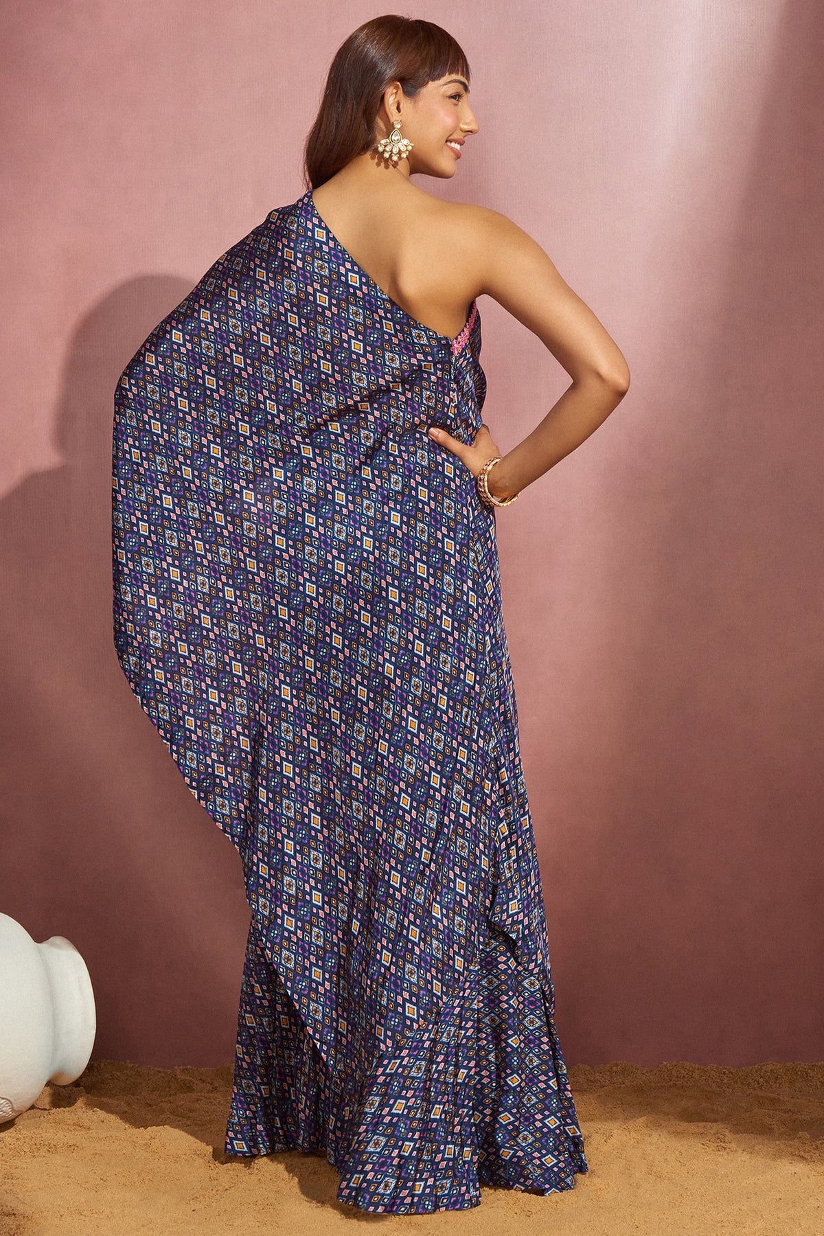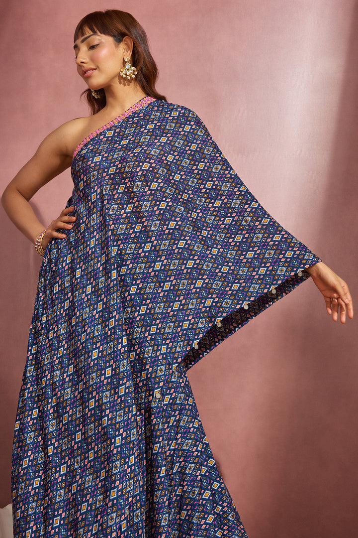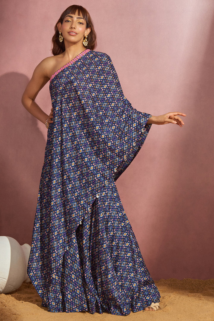 Featuring A Navy Ikkat One Shoulder Cape And Sharara In Habudai Silk. It Has An Embroided Border In Mirror Embroidery.
