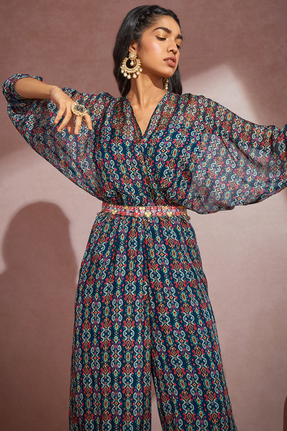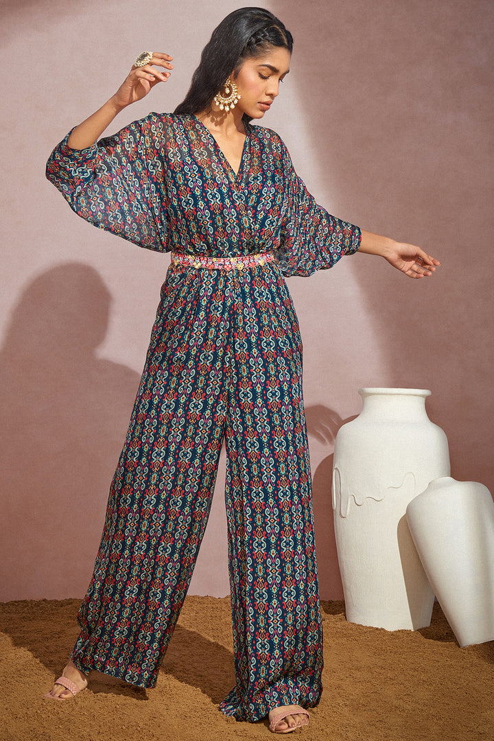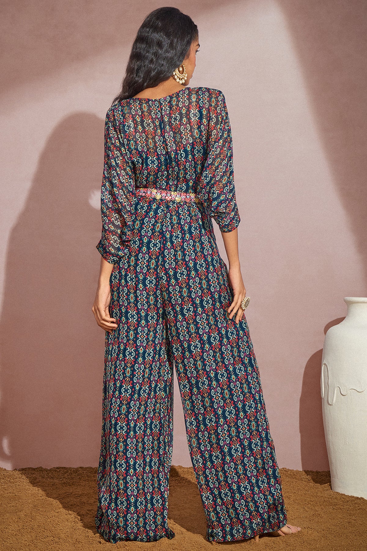 Featuting A Navy Multicolor Jumpsuit With Mirror Embroided Belt And Drops.