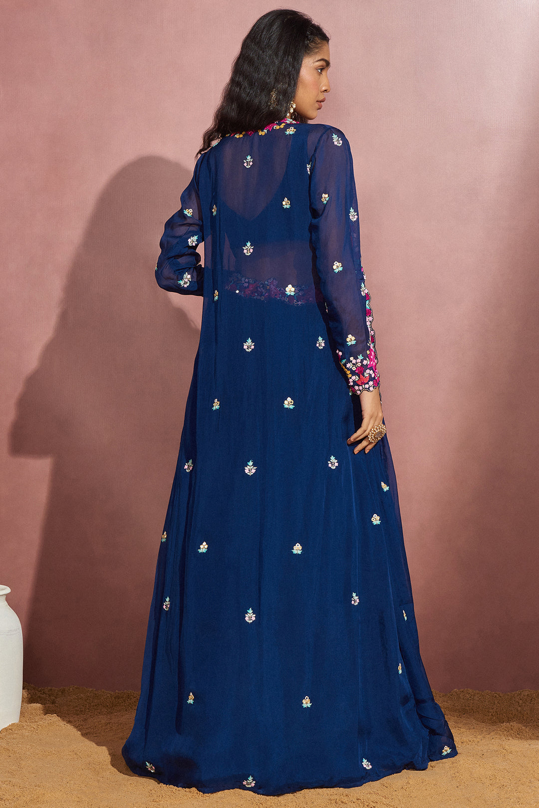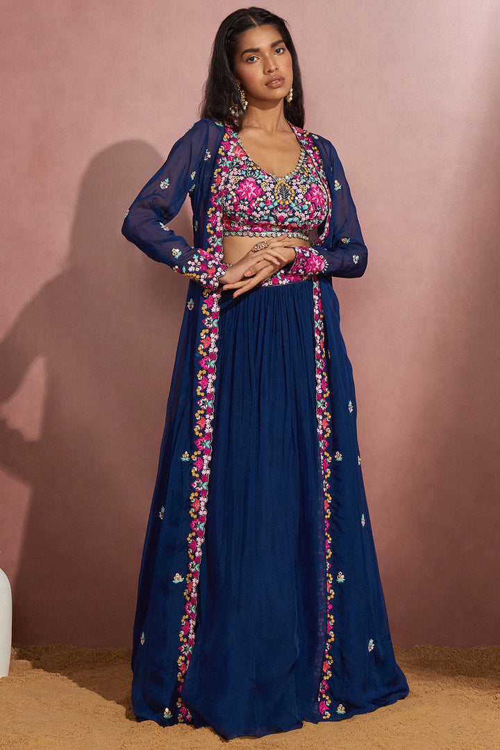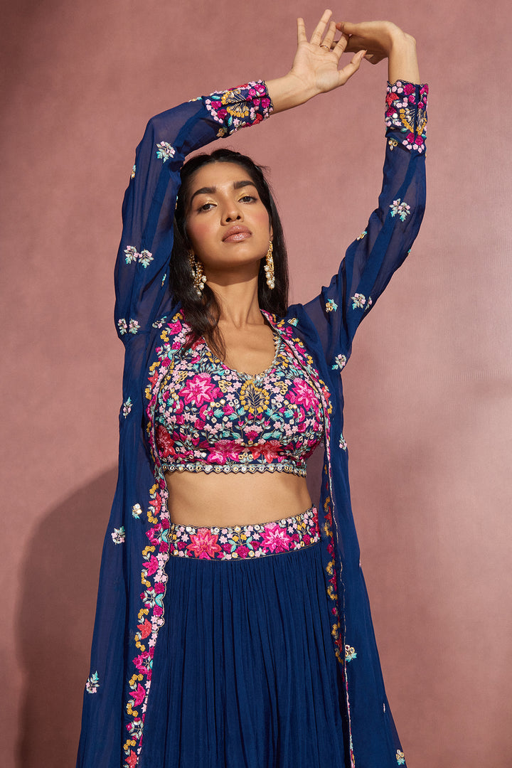 Featuring A Navy Soft Organza Cape Set With Multicolor Zardosi Embroidery On The Blouse And Cape Jacket.