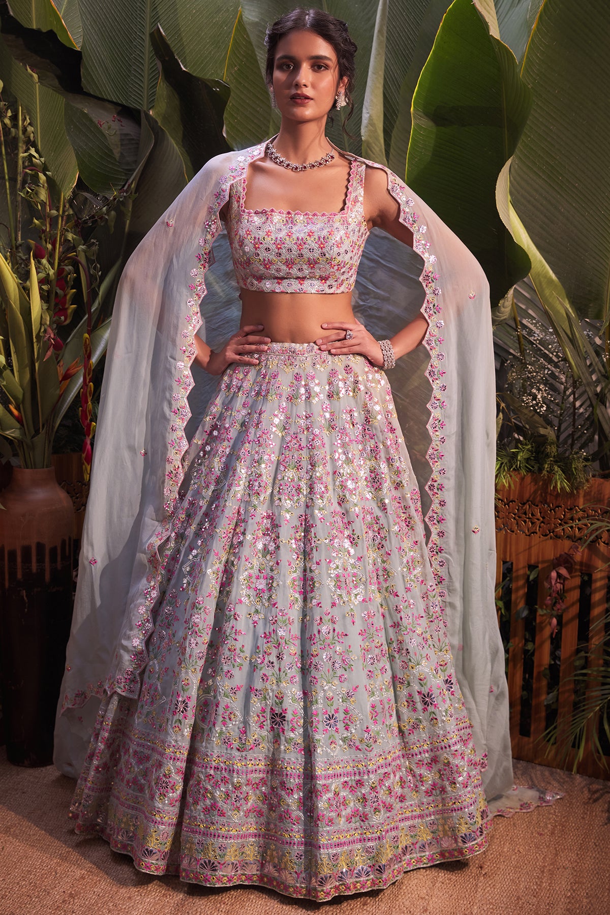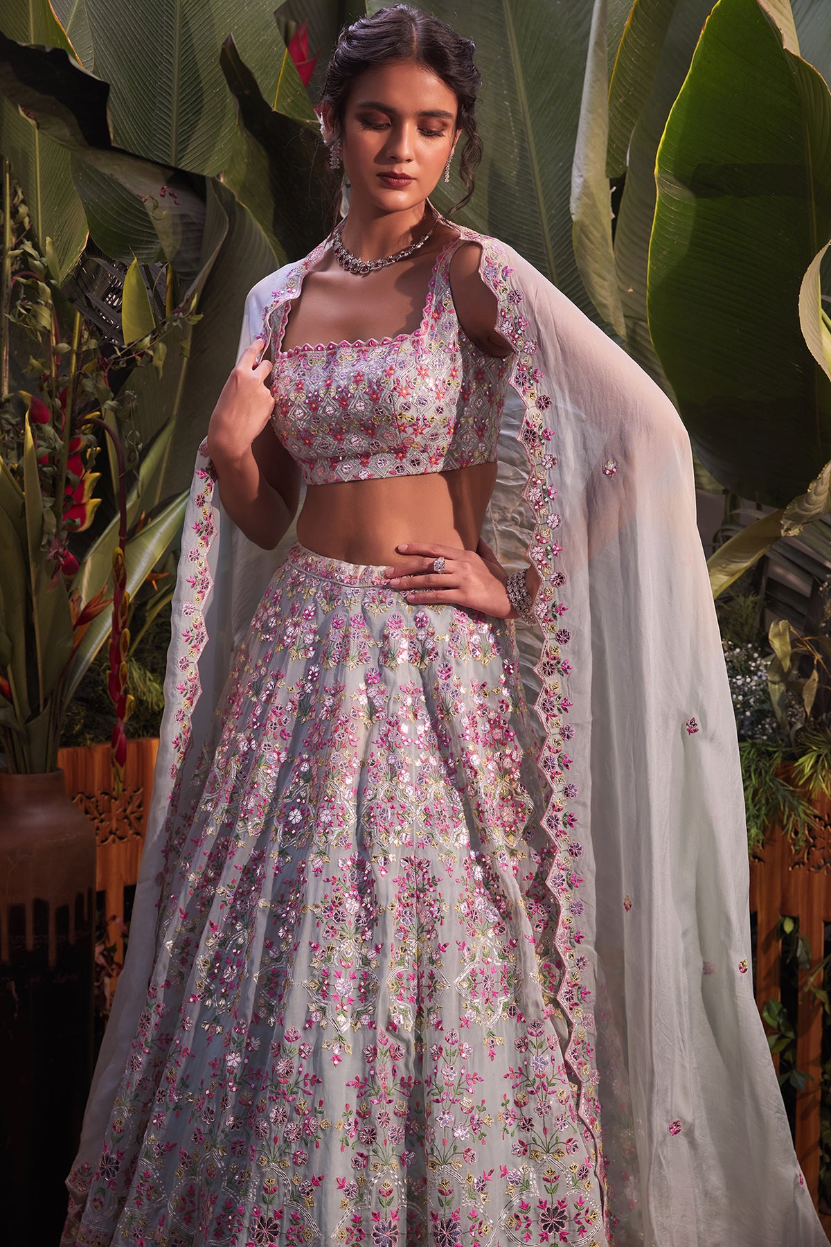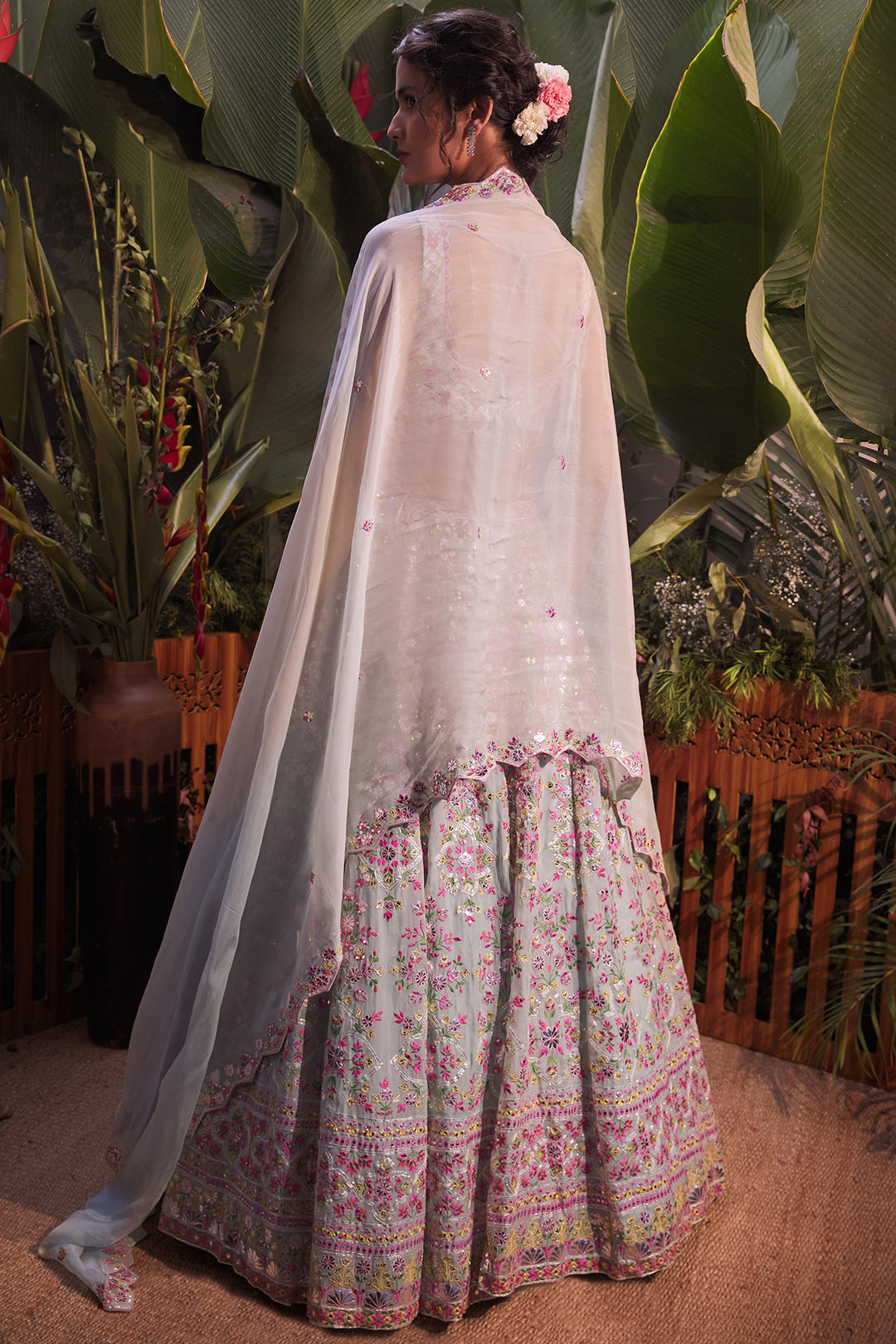 Featuring A Soft Organza Lehenga With Big Floral Motifs And Border Embroided With Mirror And Foil Applique. It Comes Along With Sleeveless Blouse And Matching Dupatta.
