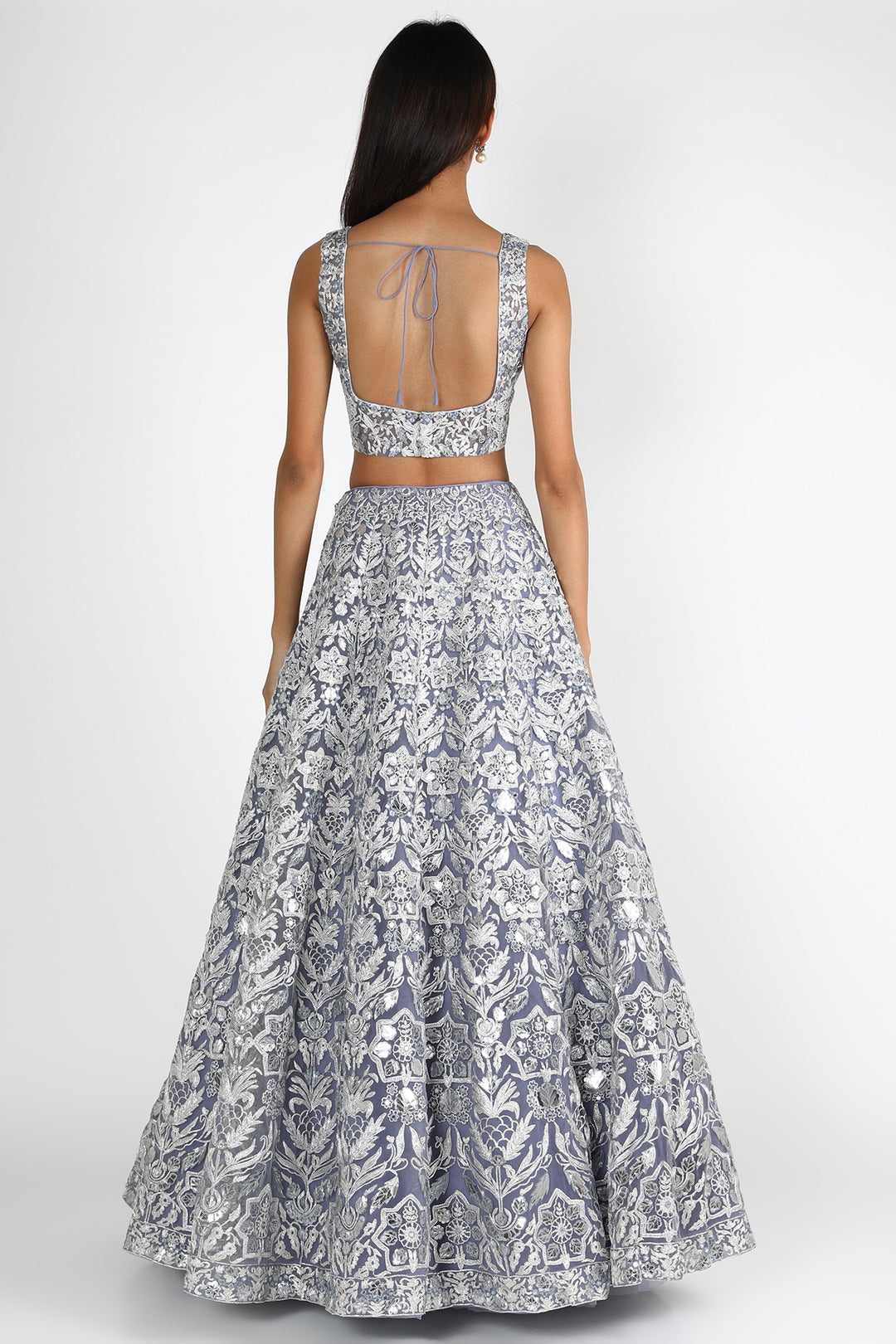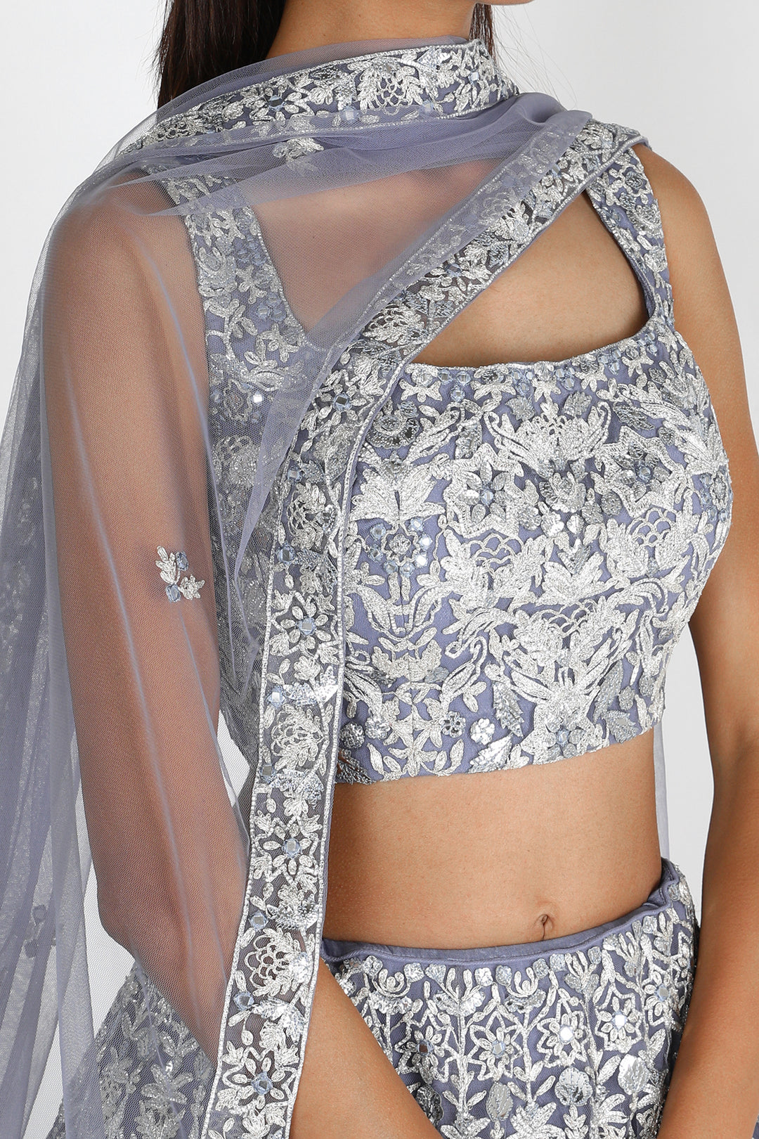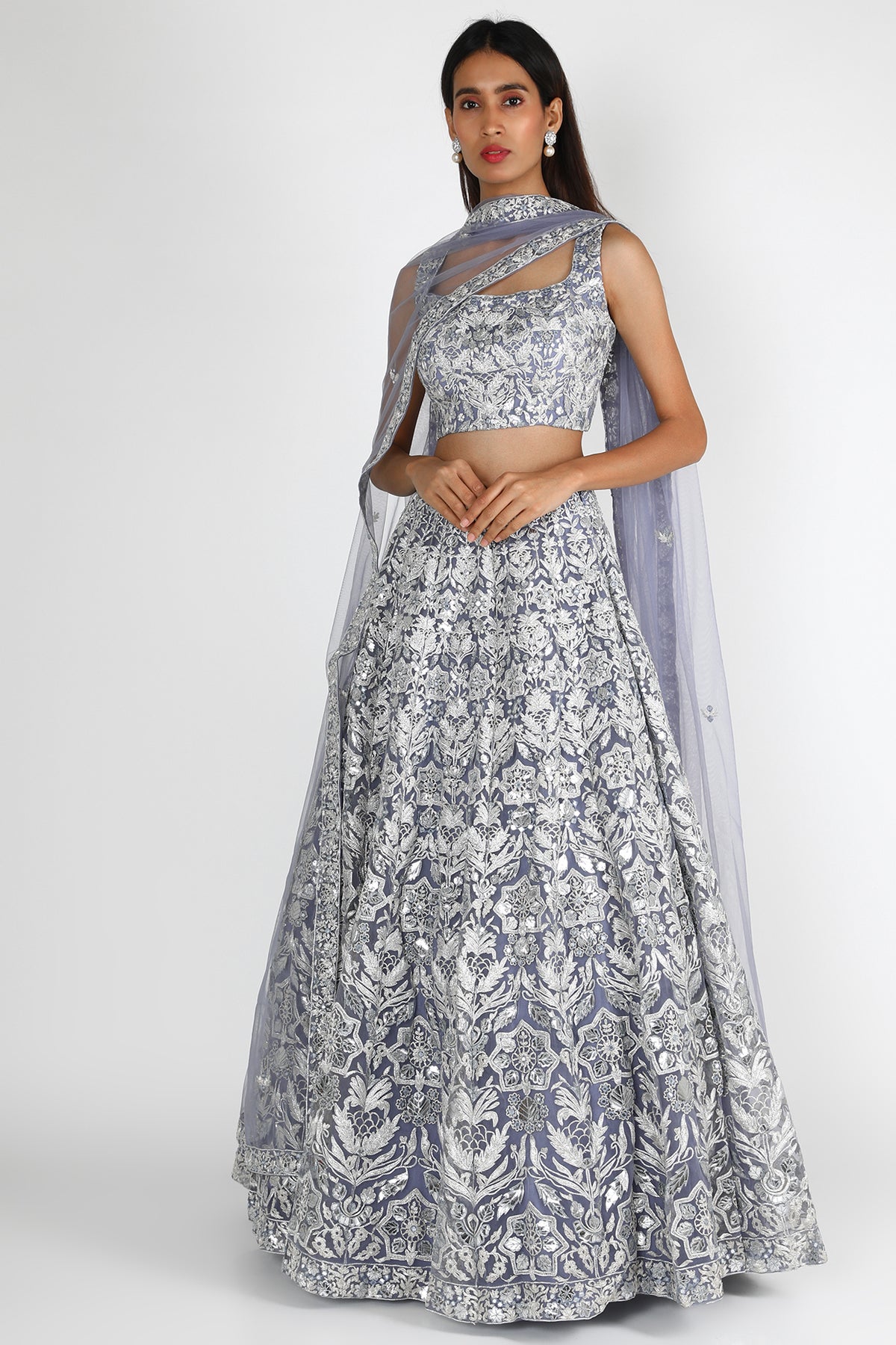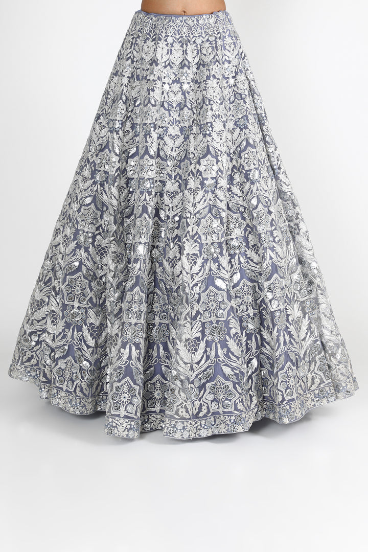 Featuring A Grey Lehenga In Net Base With Mirror And Foil Applique Embroidery Including Vintage Art Deco Motifs. It Is Paired With A Matching Blouse And Dupatta.