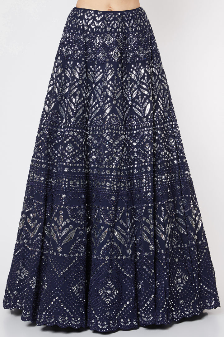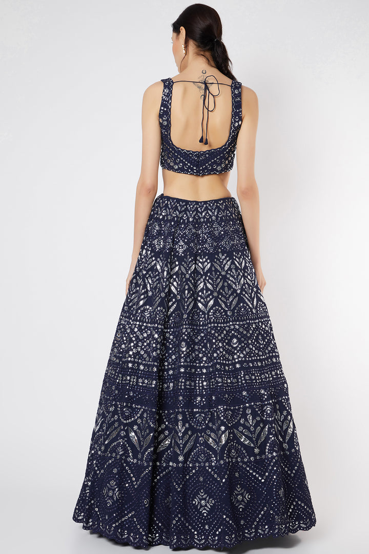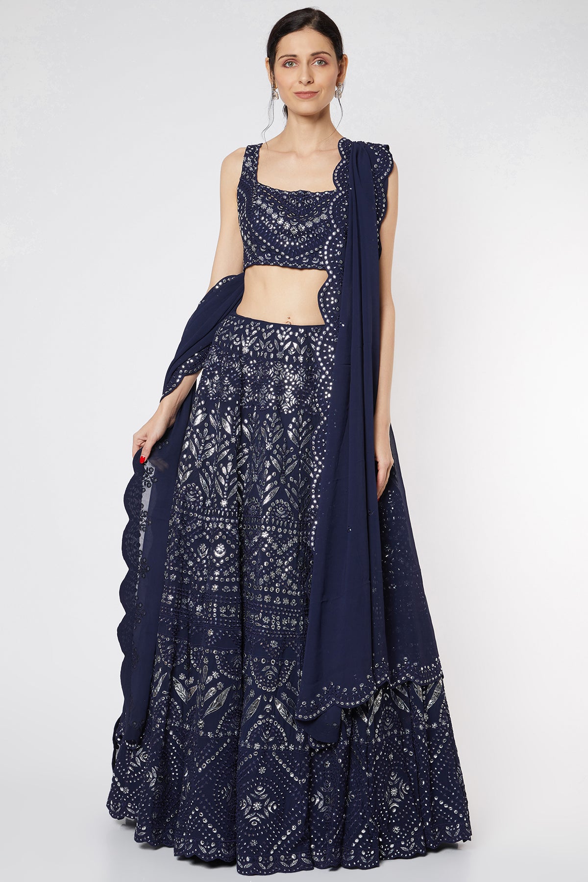 Featuring A Navy Blue Lehenga In Georgetter Base With Tribal Motif Foil Applique And Mirror Embroidery, It Is Paired With A Matching Blouse And Dupatta