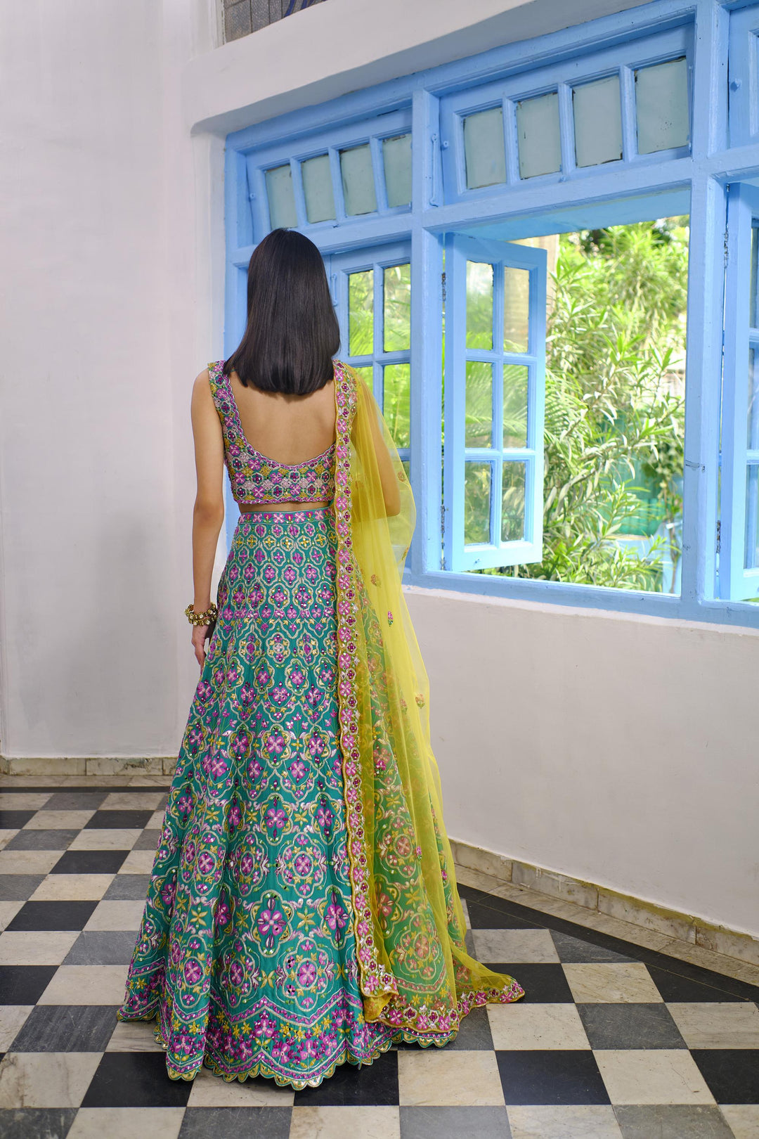 Featuring A Teal Green Silk Lehenga With Dori, Mirror And Thread Embroidery In Circular Motif Patterns. It Comes With A Matching Blouse And Yellow Net Dupatta.